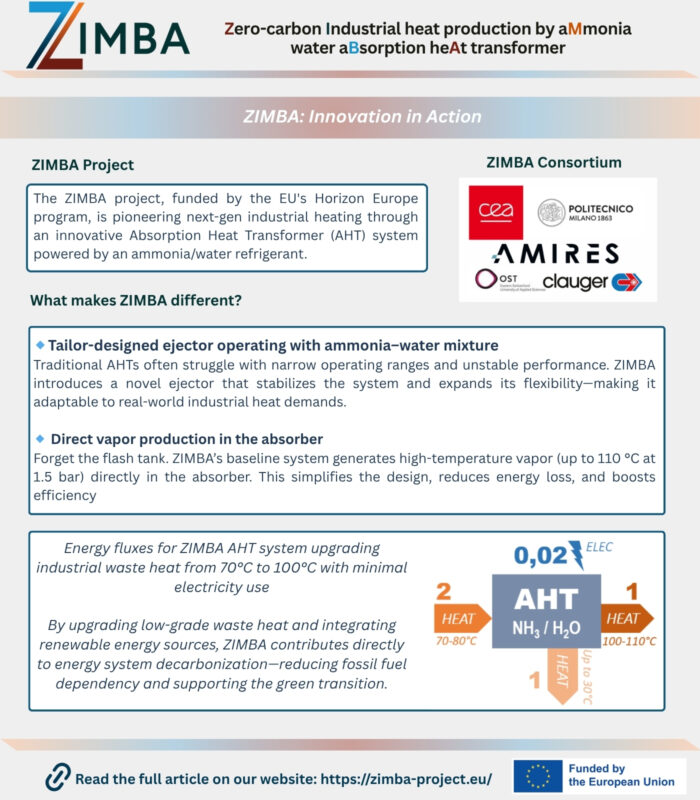As industries across Europe seek smarter ways to recover and reuse low-grade waste heat, the ZIMBA project is pushing the boundaries of absorption heat pump design. Funded by the European Union’s Horizon Europe Research and Innovation Action (RIA) program, ZIMBA aims to develop a compact, high-performance Absorption Heat Transformer (AHT) system using ammonia/water refrigerant. Designed to deliver industrial heat starting at 110 °C and later scaling to 130 °C, the system supports broader energy system decarbonization and complements the integration of renewable energy sources.